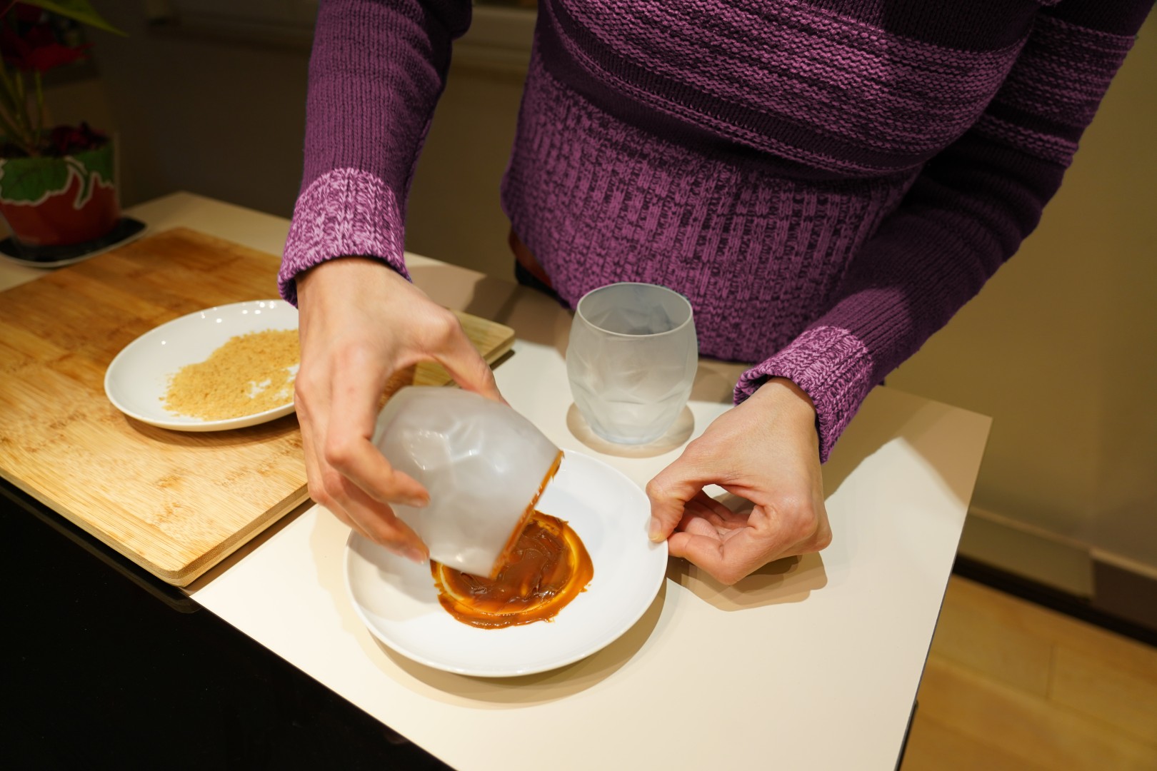 - Kolačiće s karamelom zdrobimo u fini prah i stavimo na mali plitki tanjur.