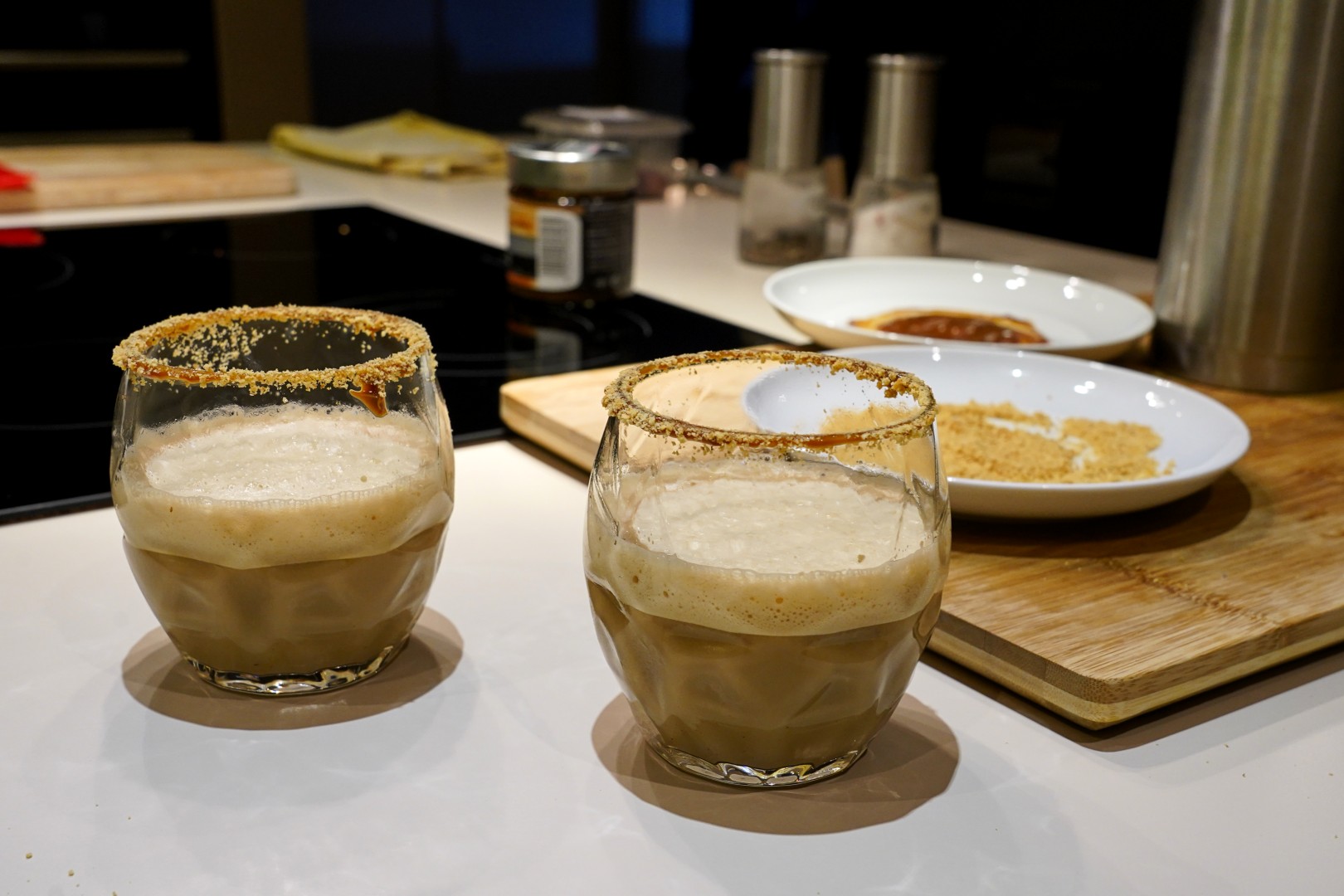 - Hladne čaše umočimo u Dulce De Leche, a zatim u usitnjene kekse, da se prah zalijepi po rubu. U čaše stavimo par kockica leda.