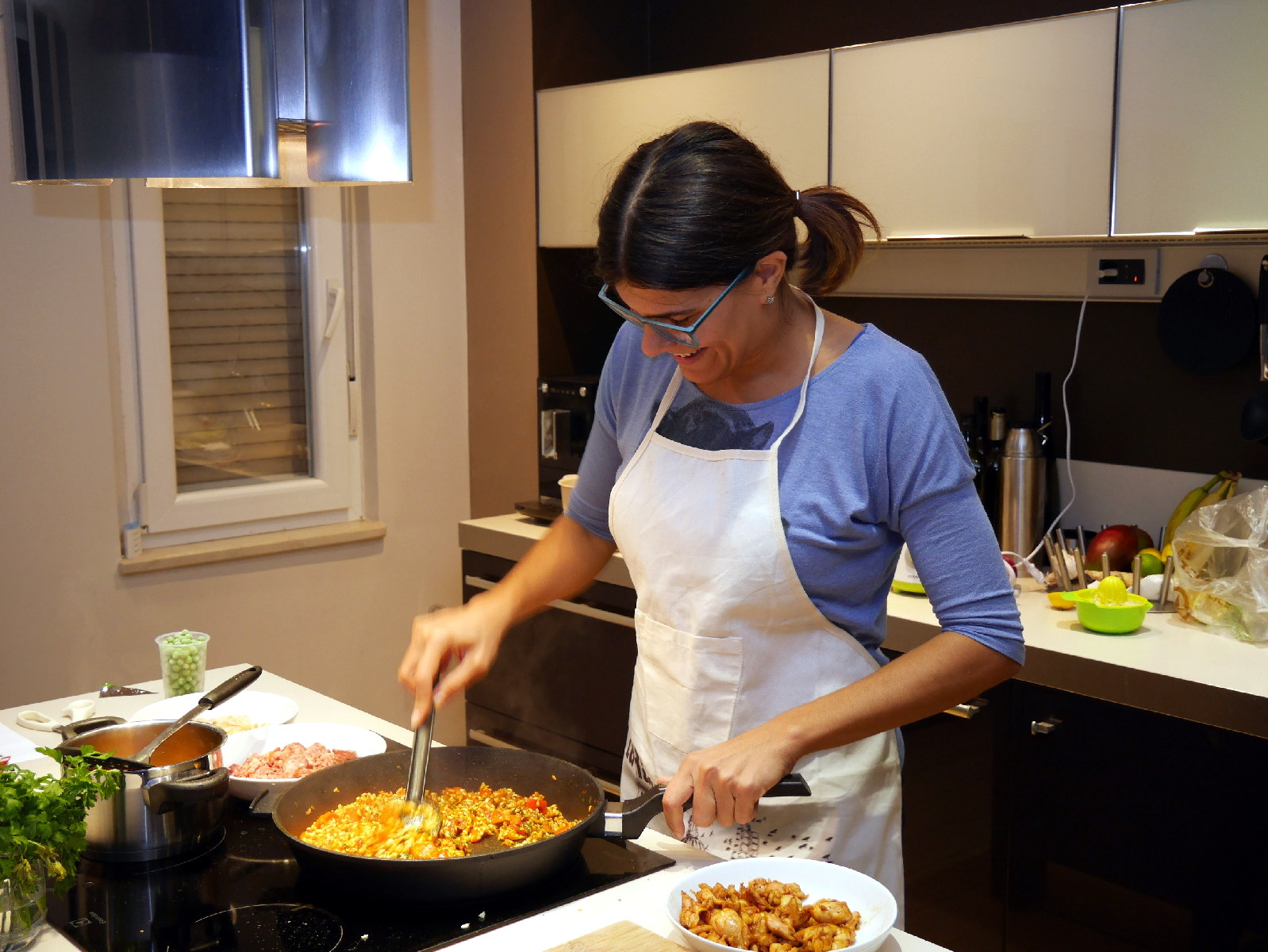 - U tavu ubaciti pripremljeno začinsko bilje, uliti temeljac sa šafranom, ubaciti piletinu, kobasice, pršut i smrznuti grašak. Smanjiti vatru, kuhati 10 minuta uz često miješanje.