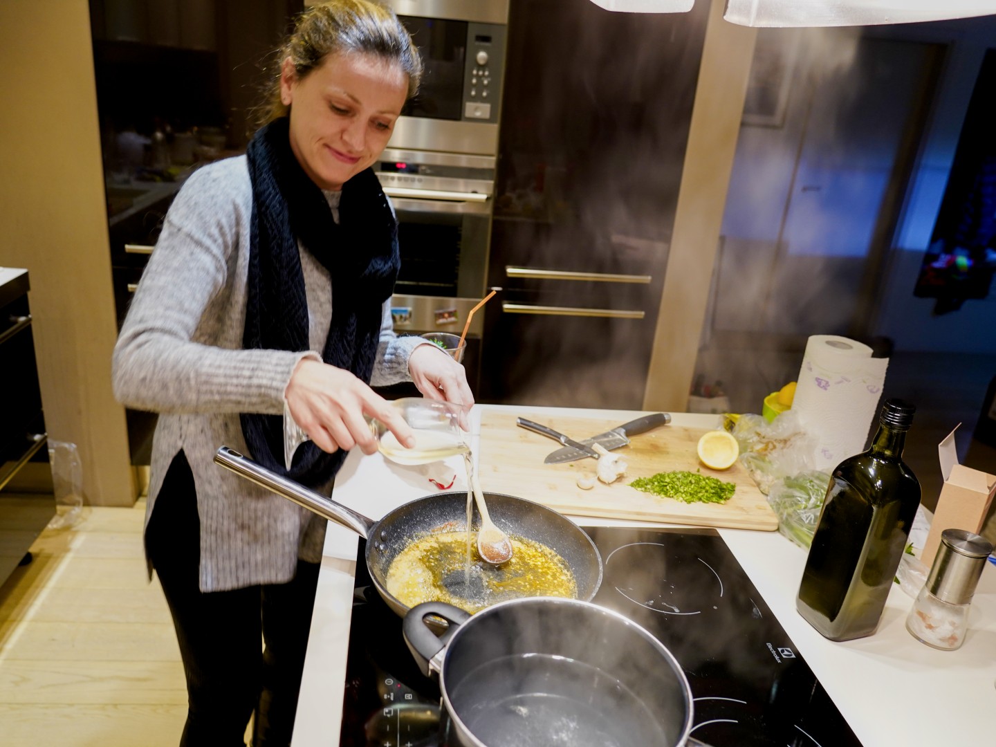 - Za to vrijeme zagrijemo maslac i maslinovo ulje na srednje jakoj vatri u velikoj tavi.