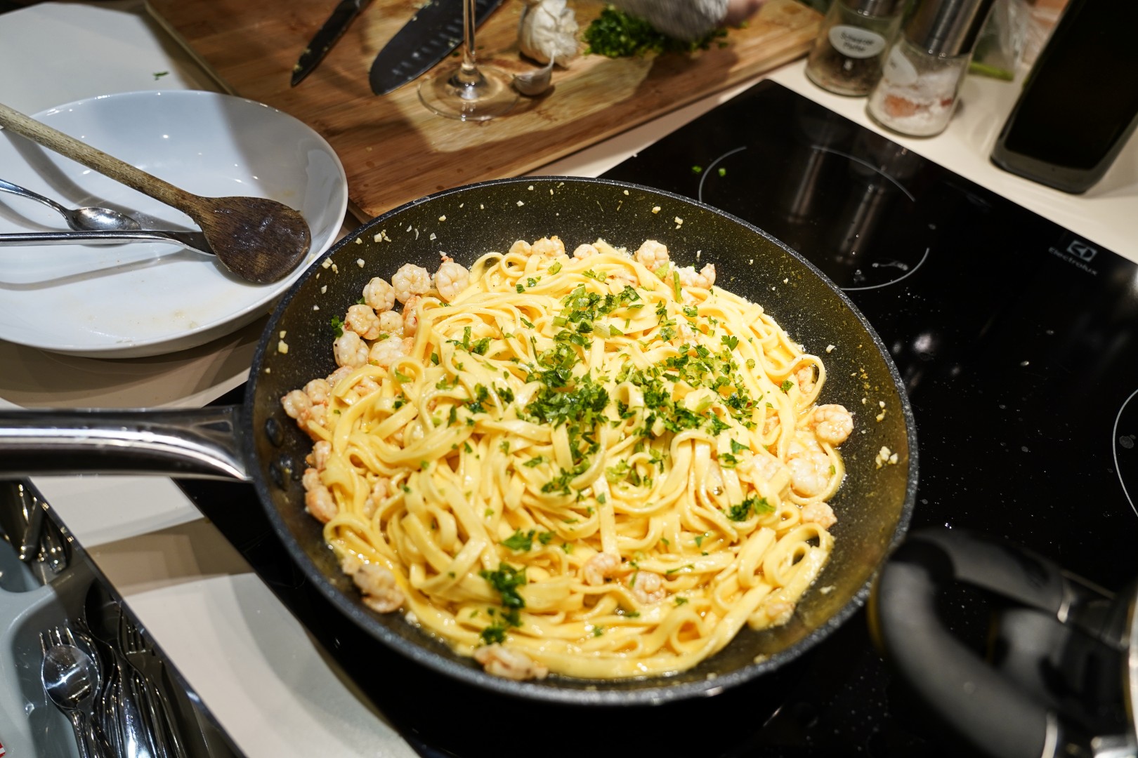 - Dodamo tjesteninu u tavu i promiješamo da se sjedini. Ako se umak čini gustim, dodamo malo vode u kojoj se kuhala tjestenina.