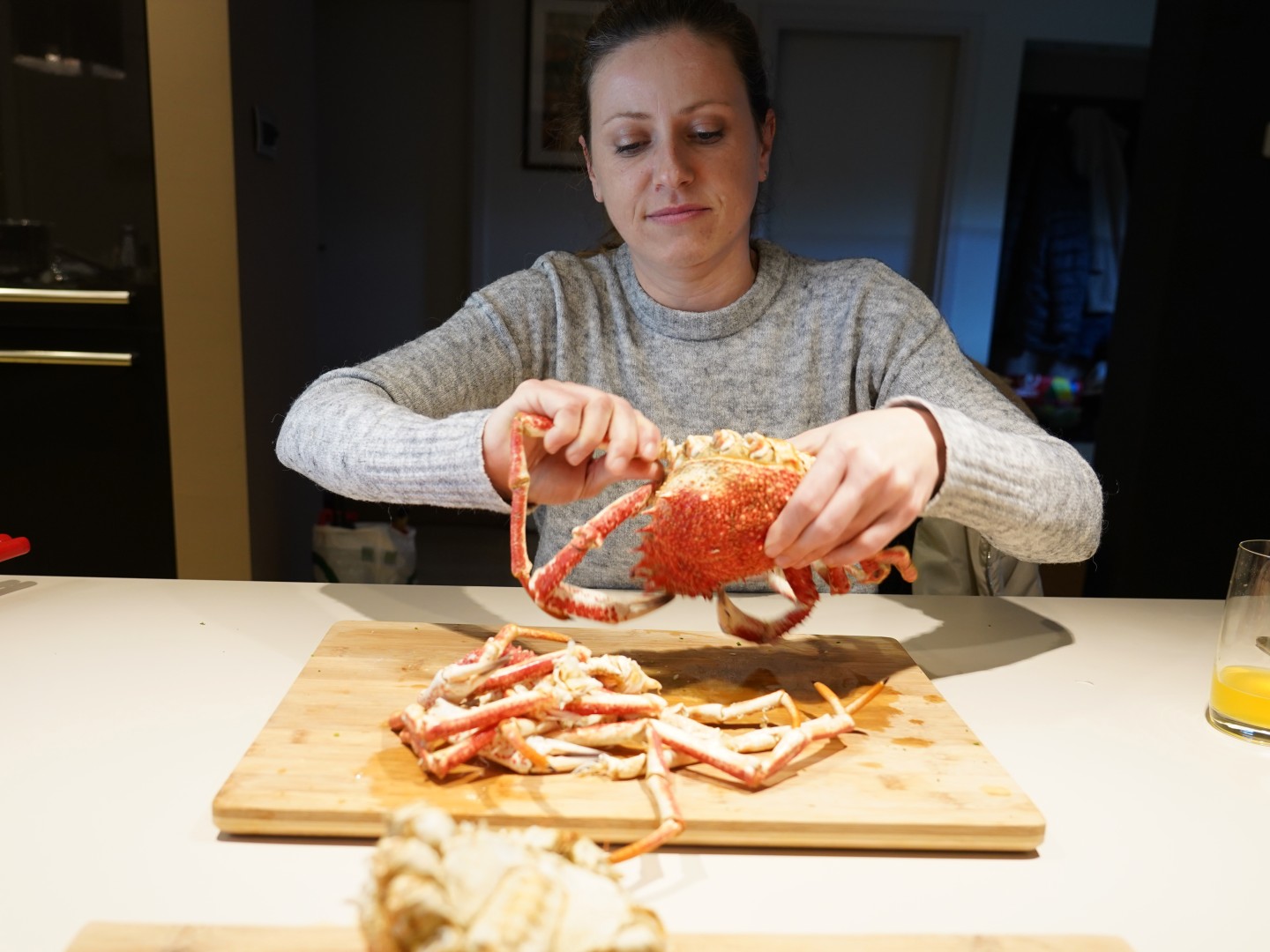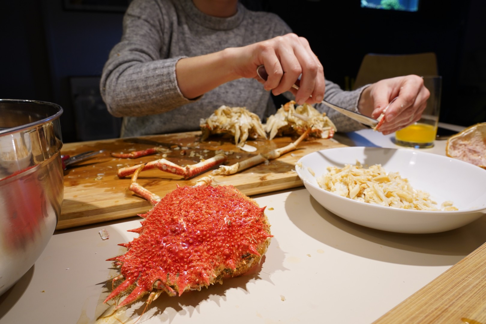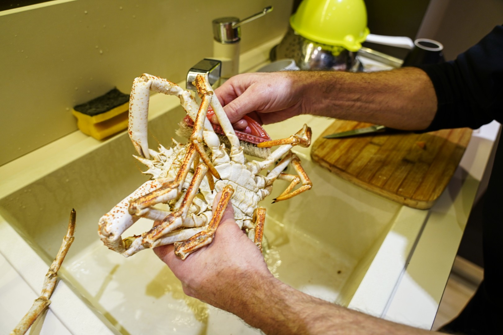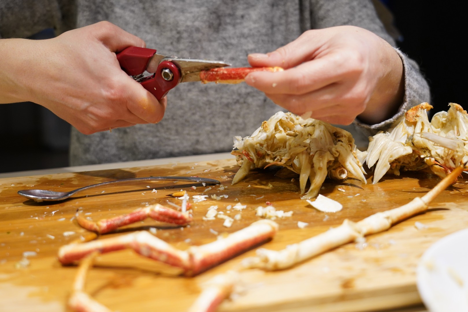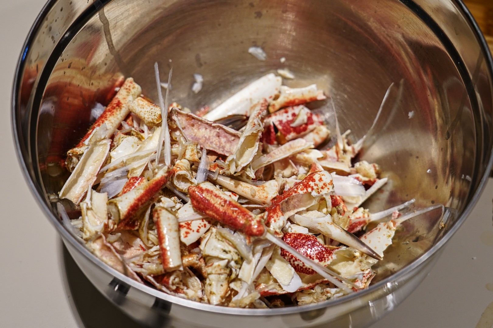 - Odvojimo noge od tijela. U nožnim člancima je većina mesa. Članke potučemo čekićem ili zdrobimo kliještima ili prerežemo jakim škarama. Meso sastružemo malom žličicom.