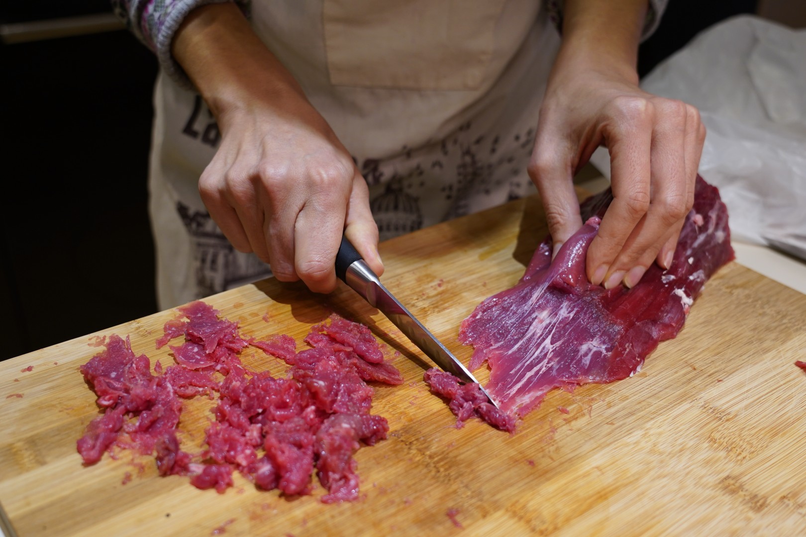 - Meso na dasci sastružemo nožem da ga očistimo od žilica i kožica, te sitno nasjeckamo.